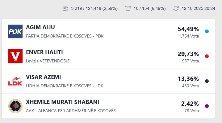 Kandidati për kryetar të Ferizajt nga PDK-ja, Agim Aliu, po prin dukshëm sipas votave të para që janë numëruar.